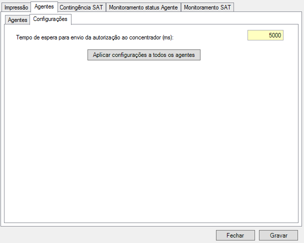 Já na aba Configurações o usuário poderá definir a configuração padrão do Tempo de espera para envio da autorização ao concentrador (ms) para os Agentes que serão criados no futuro.