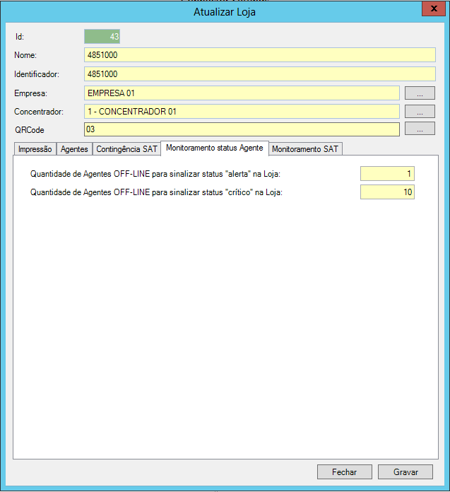 •Quantidade de Agente OFF-LINE para sinalizar status alerta: Neste campo o usuário determinará a quantidade de Agentes que estarão offline para sinalizar no e-monitor o status de alerta. •Quantidade de Agente OFF-LINE para sinalizar status crítico: Neste campo o usuário determinará a quantidade de Agentes que estarão offline para sinalizar no e-monitor o status crítico.