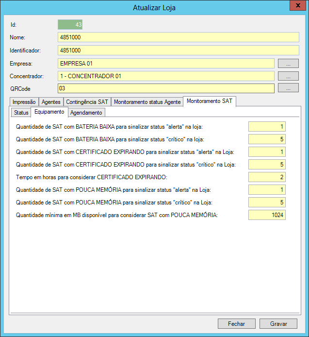 •Quantidade de SAT com CERTIFICADO EXPIRANDO para sinalizar status alerta: Neste campo o usuário determinará a quantidade de equipamentos SAT com CERTIFICADO EXPIRANDO para sinalizar no e-monitor o status alerta. •Quantidade de SAT com CERTIFICADO EXPIRANDO para sinalizar status crítico: Neste campo o usuário determinará a quantidade de equipamentos SAT com CERTIFICADO EXPIRANDO para sinalizar no e-monitor o status crítico. •Tempo em HORAS para considerar CERTIFICADO EXPIRANDO: Neste campo o usuário determinará o tempo em HORAS para considerar o certificado utilizado como expirando. •Quantidade de SAT com POUCA MEMÓRIA para sinalizar status alerta: Neste campo o usuário determinará a quantidade de equipamentos SAT's com POUCA MEMÓRIA para sinalizar no e-monitor o status alerta. •Quantidade de SAT com POUCA MEMÓRIA para sinalizar status crítico: Neste campo o usuário determinará a quantidade de equipamentos SAT's com POUCA MEMÓRIA para sinalizar no e-monitor o status crítico. •Quantidade mínima em MB disponível para considerar SAT com POUCA MEMÓRIA: Neste campo o usuário determinará a quantidade mínima em MB disponível para considerar o equipamento SAT com pouca memória.