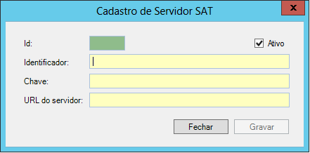 Identificador: Nome Identificador do Servidor SAT. Chave: Este campo irá conter a chave que servirá de identificação no xml de configuração. URL do servidor: Endereço http do Servidor SAT em questão. Checkbox "Ativo": Este vira como marcado por padrão, porém poderá ser desmarcado caso haja necessidade. Essa marcação sinaliza se o Servidor Sat em questão encontra-se disponível.