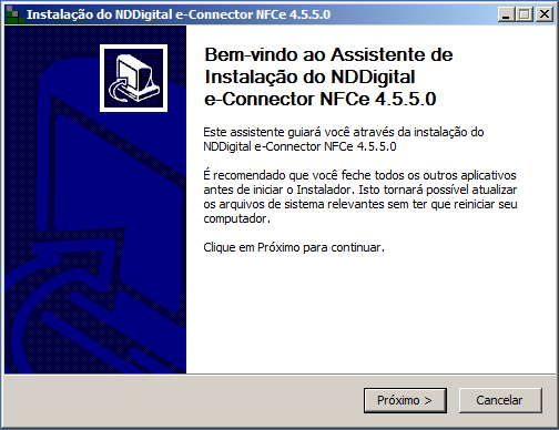 Passo 1: Execute o arquivo de instalação do e-Connector NFC-e disponibilizado pela NDDigital. Você também pode fazer o download dos instaladores acessando o site da NDDigital, efetuando seu cadastro de usuário. Para isso, acesse http://ndd.com.br/ e efetue seu cadastro.