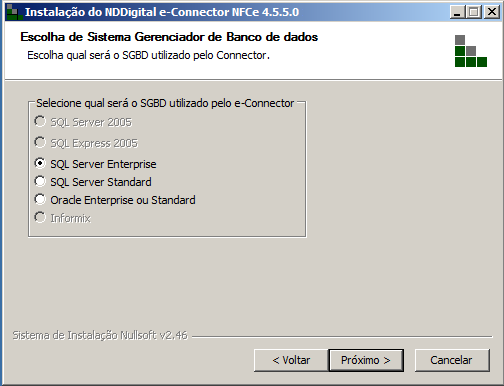 Passo 2: Selecione o Sistema Gerenciador de Banco de dados a ser utilizado pelo Connector NFC-e. Os SGBD’s compatíveis com o módulo e-Connector NFC-e são:
