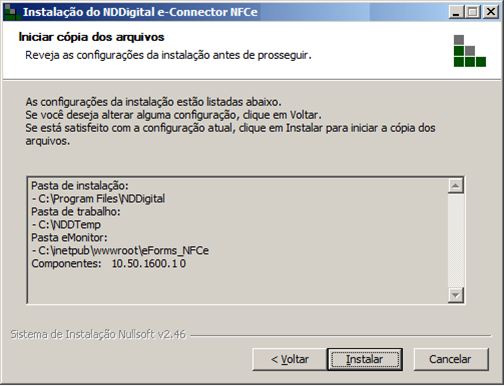 Passo 8: As configurações realizadas são listadas antes de iniciar a instalação. Reveja as configurações, caso deseje alterar alguma delas, clique em voltar. Se todos os parâmetros configurados estiverem de acordo com o desejado, clique no botão Instalar para iniciar a instalação do produto.