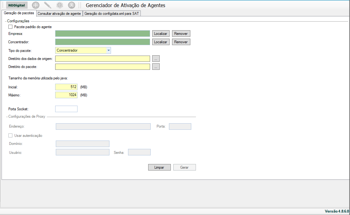 a.Tipo do pacote: Agente ou Concentrador, campo não estará habilitado caso a opção Pacote padrão do agente esteja marcada. b.Diretório dos dados de origem: Deverá ser selecionado o diretório onde se encontra o pacote do agente ou concentrador. c.Diretório Pacote: Deverá ser selecionado o diretório onde o pacote de instalação será gerado. d.Tamanho Inicial: Deverá ser informado o tamanho de memória inicial que será disponibilizado para o processo do agente (em MB). e.Tamanho Final: Deverá ser informado o tamanho máximo de memória que será disponibilizado para o processo do agente (em MB). f.Porta Socket: Deverá ser informado a porta utilizada para conexão socket, caso não utilize, deixar o campo vazio. g.Configurações de proxy: Esta opção irá ser habilitada para preenchimento das informações caso o tipo de pacote seja Agente. Marque a opção tipo do pacote Agente e logo em seguida preencha os campos Endereço e Porta, que são parâmetros obrigatórios.
