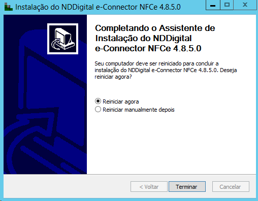 A atualização do Connector Settings NFC-e foi realizado com sucesso, para concluir a instalação escolha Reiniciar Agora e Terminar.