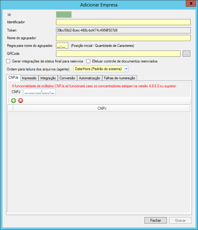 ▪Identificador: Informe o nome da empresa que deseja cadastrar; ▪Token: Ao cadastrar uma empresa o e-forms NFC-e cria automaticamente um Token para controle de cadastro; ▪Nome do agrupador: Esse nome será utilizado para visualização do Dashboard no monitor (Ex: Loja, Filial, Departamento); ▪Regra para nome do agrupador: Nesse campo conterá a posição inicial e tamanho do campo que deverá ser extraído do identificador (chave do e-agente) disponibilizado na tabela de entrada (tbdatabaseinput). (Ex: 5-10)