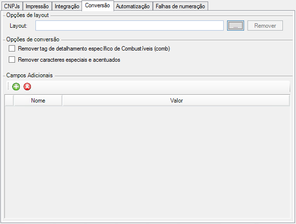 ▪Layout: Neste campo será possível indicar o uso de um layout específico para a empresa. ▪Remoção da Tag de detalhamento específico de Combustível (comb): Fará a remoção automática da tag comb caso o checkbox for marcado e o cadastro Salvo. ▪Remoção da caracteres especiais e acentuados: Fará a remoção automática dos caracteres especiais e acentuados das notas enviadas. ▪Campos Adicionais: Atualmente utilizado para configuração de B2B e B2B Diretório. ▪Campo: Deve se preenchido como B2B ou B2BDirectory. ▪Valor: Para o uso do B2B, e-mail do destinatário.