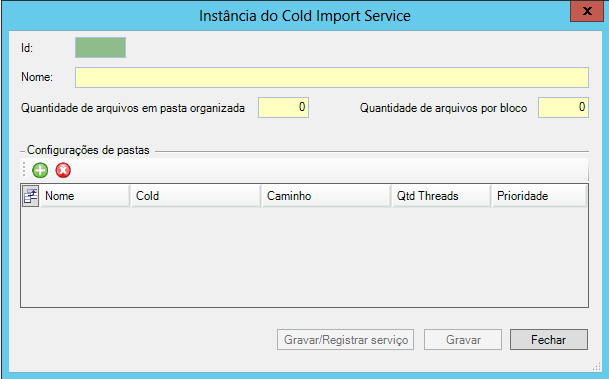 ▪Nome: Nome que será dado para determinada Instância; ▪Quantidade de arquivos em pasta organizada: Número máximo de notas em pastas organizadas pelo Serviço; ▪Quantidade de arquivos por bloco: Número máximo de notas em blocos capturados pelo Serviço. ▪Configurações de Pastas: Nesse segmento será possível adicionar as pastas que o serviço do Cold Import fará o processo de inserção no Cold.