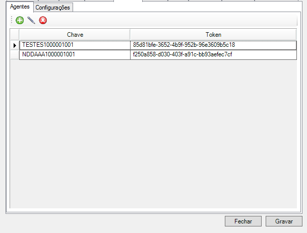 ▪Chave: A chave é basicamente o nome do agente, determinado no arquivo que é enviado pelo PDV. ▪Token: Para cada Agente é Gerado um token automaticamente. ▪Codificação: Escolha uma das Codificações para o Agente utilizar ao processar os documentos eletrônicos.