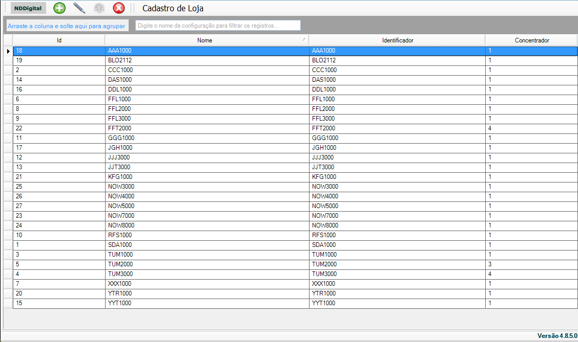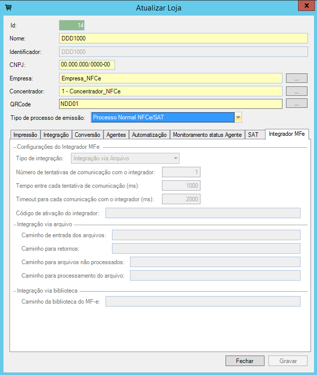 ▪ ▪Nome: Nome da Loja a ser cadastrada. ▪Identificador: Deverá ser o nome que servirá de Identificador da Loja. ▪CNPJ: Na criação automática de Loja é obtido o CNPJ do xml de envio e caso já exista a Loja cadastrada e não tenha o CNPJ, será atualizado. ▪Empresa: Campo responsável por informar a empresa que a loja será vinculada. Para selecionar uma empresa, que foi previamente cadastrada, clique em ▪Concentrador: Neste campo, ao clicar em ▪QRCode: Campo responsável por informar um QRCode utilizado pela loja. Para selecionar um novo QRCode, que foi previamente cadastrado, clique em ▪Tipo de Processo de Emissão: oProcesso Normal NFCe/SAT - Para utilização do processo de envio SAT e NFCe sem a utilização do Integrdor. Importante lembrar que para processamento MFe é obrigatório o uso do Integrador. oProcesso Integrador Agente - Para o processamento SAT Agente MFe com a utilização do Integrado. oProcesso Integrador SatServer Agente - Para processamento do MultiSat Agente MFe com a utilização do integrador. oProcesso Integrador SatServer Concentrador - Para processamento do MultiSat Concentrador MFe com a utilização do integrador.