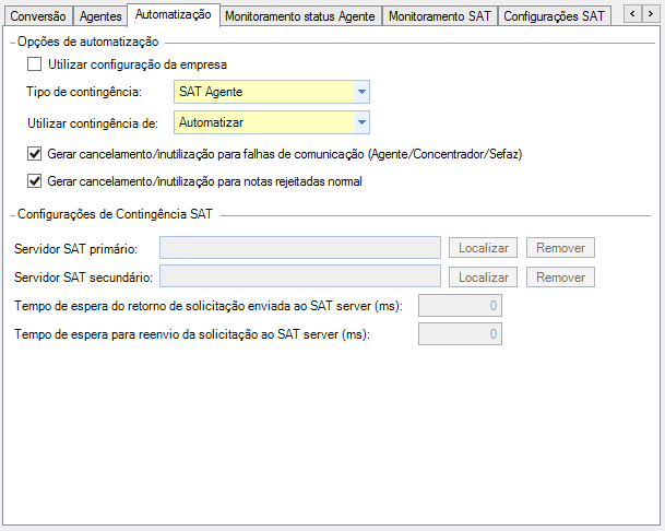 ▪Tipo de contingência: Selecionar um tipo de contingência disponivel: oNormal oSAT Agente oSAT Server Agente oSAT Server Concentrador oNenhum