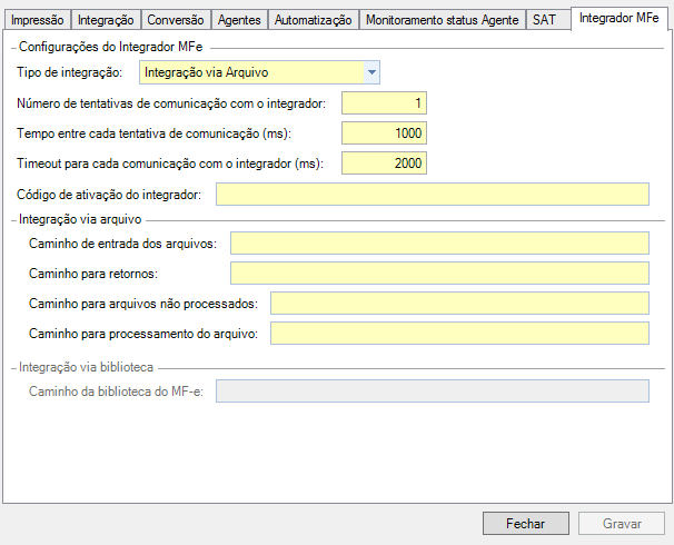 •Tipo de Integração: oIntegração Via Arquivo: Processo utilizado para comunicação com o Integrador; •Número de Tentativas de Comunicação com o Integrador: Os processo de venda e cancelamento são os únicos processo que possuem a “repescagem” junto ao hardware MFe em SAT Agente. Em caso de falha venda ou do cancelamento é consultado o Status do integrador e caso este esteja “OK” é disparado a consulta do número de sessão do hardware. Caso o integrador não esteja OK o processo é encerrado com erro, Esta opção será habilitada, somente quando o Tipo de Processo de Emissão for "Processo Integrador Agent" •Tempo entre cada Tentativa de Comunicação (ms): Tempo que o sistema irá aguardar antes de executar uma nova tentativa, Esta opção será habilitada, somente quando o Tipo de Processo de Emissão for "Processo Integrador Agent" •Timeout para cada Comunicação com o Integrador (ms): O timeout é para cada comunicação com o integrador ou seja, para cada tentativa o timeout é contado de forma integral; •Código de Ativação do Integrador: Código AC; •Caminho de Entrada dos Arquivos: A pasta input é criada de forma automática pelo integrador, porém podem ser configuradas no integrador em outros diretórios; •Caminho para Retornos: A pasta output é criada de forma automática pelo integrador, porém podem ser configuradas no integrador em outros diretórios; •Caminho para Arquivos não Processados: Na pasta outunprocessfolder o sistema irá armazenar todo e qualquer arquivo que ficar perdido nas pastas input e output; •Caminho para Processamento do Arquivo: Na pasta processfolder o sistema irá armazenar todos os documentos que foram processados corretamente pelo sistema;