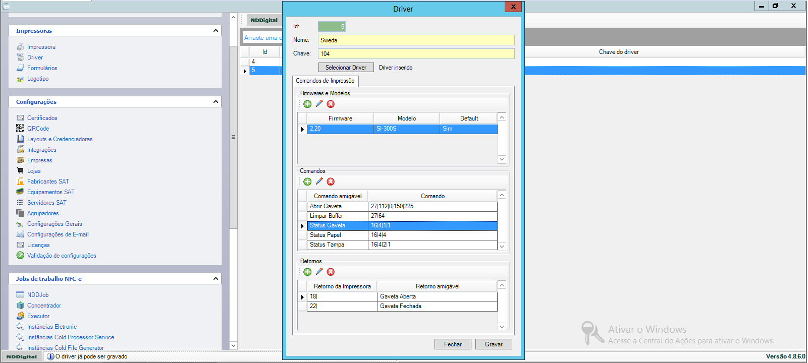 ▪Nome: Usuário deverá colocar o nome da impressora/driver que será utilizado. ▪Chave: Deverá colocar a chave do driver que será utilizada. ▪Selecionar Driver: Deve ser selecionado o driver correspondente a sua impressora de preferência. •101 Bematech •102 Daruma •103 Epson •104 Sweda