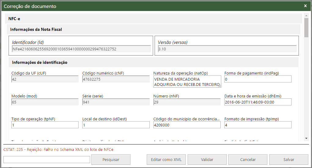 Nessa opção surgirá em modelo de formulário todos os campos da nota enviada, e abaixo informando qual o erro em específico. Após a correção basta o usuário clicar em Validar Documento para verificar se algo mais está errado e por fim, clicar em Salvar e a nota estará corrigida.