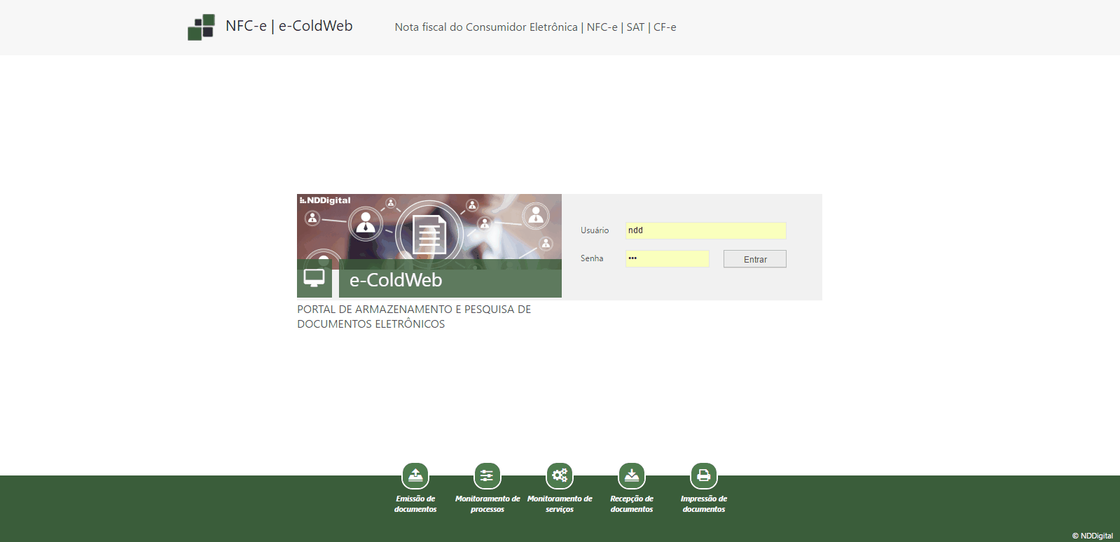 Para acessar o e-ColdWeb, clique no ícone criado na área de trabalho, ou acesse pelo menu Iniciar\Todos os Programas\NDDigital\Cold\Cold Web. Será exibida a tela de login, como mostra a imagem abaixo: