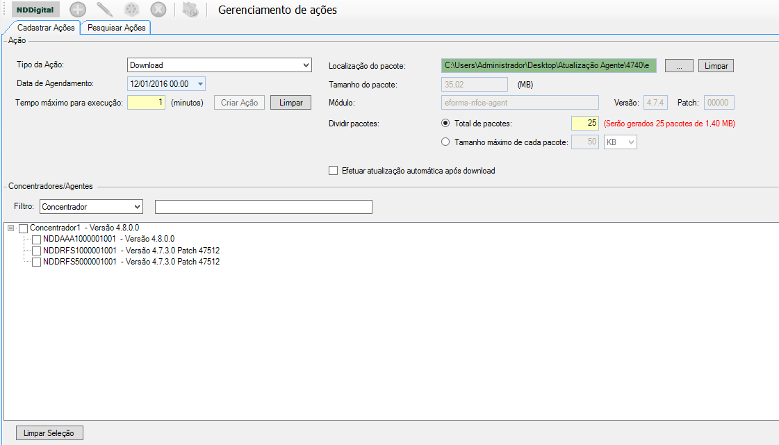 Esta ferramenta vai disponibilizar telas de gerenciamento e controle de ações a serem realizadas para concentradores/agentes. Teremos 4 ações (Download, Atualização, Requisição de logs e alteração do nível de detalhamento dos logs).