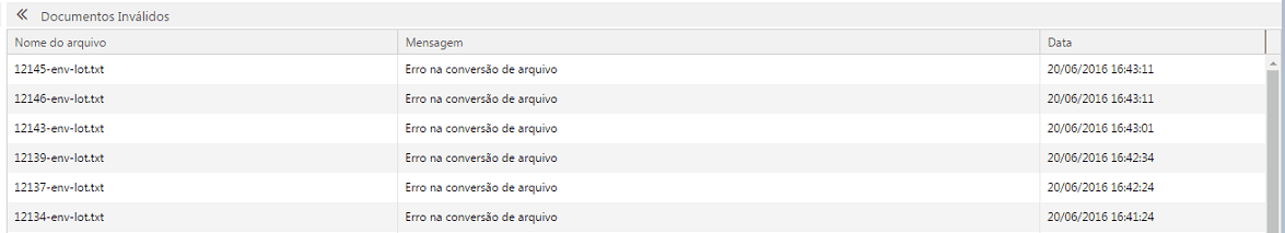 No grid da aba de Documentos Inválidos, são exibidos os seguintes itens: