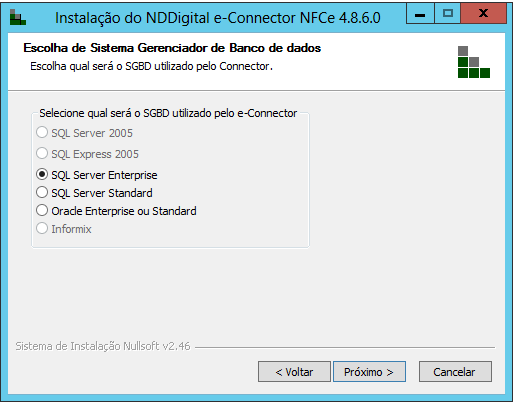 Selecione o Sistema Gerenciador de Banco de dados a ser utilizado pelo Connector NFC-e. Os SGBD’s compatíveis com o módulo e-Connector NFC-e são: Microsoft SQL 2008 Server; Microsoft SQL Server 2012; Oracle 10g ou 11g;