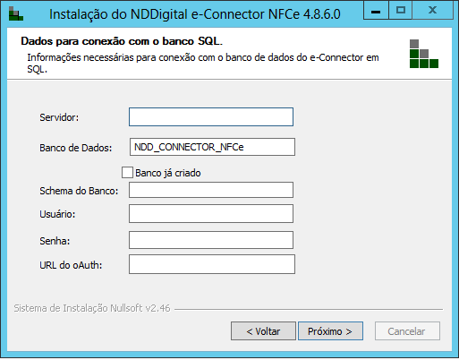 ▪ ▪Servidor: nome ou endereço IP do servidor; ▪Banco de Dados: nome da base de dados; ▪Opção “Banco já Criado”: esta opção será marcada quando a criação da base de dados de processamento do e-Connector NFC-e for realizada através de script DDL, executado pela equipe responsável por manter o servidor de banco de dados no cliente; ▪Schema do Banco: Serve para especificar qual Schema deverá ser utilizado para criação dos objetos de banco. Essa opção só deve ser utilizada onde houver política para criação de objetos em banco de dados definida pela equipe responsável por manter o servidor de banco de dados no cliente, caso contrário deixar o campo em branco; ▪Usuário: nome do usuário; ▪Senha: senha do usuário em questão.