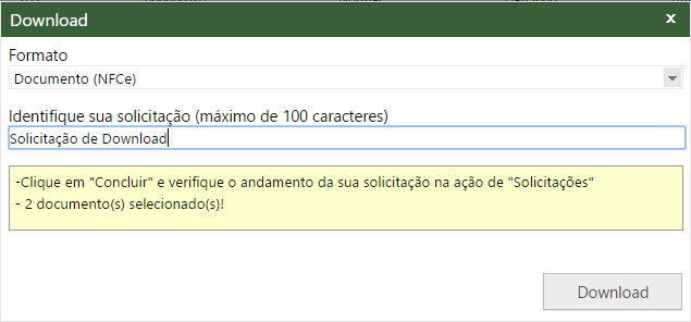 Quando selecionado mais de um documento no grid ou mais de um formato for escolhido para o processo de download, é obrigatório preencher o campo Identifique sua solicitação, na qual pode ser visualizado o andamento das solicitações através da tela Solicitações.