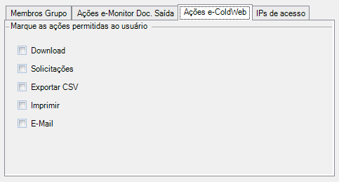 Esta opção deve ser utilizada para realizar um bloqueio de acesso aos módulos e-Monitor e e-ColdWeb por IP. Ao ser selecionado um usuário e inserido um IP na aba IPs de acesso, este usuário somente conseguirá acessar os módulos e-Monitor e e-ColdWeb do computador que possuir o IP informado.