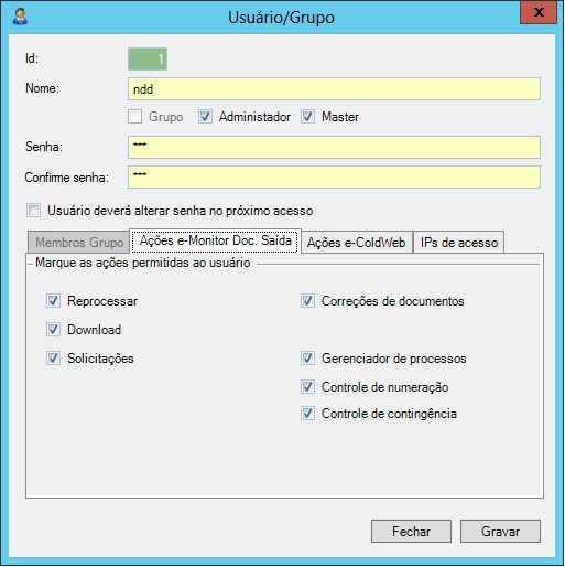 ▪Nome: Digite um nome para o usuário. ▪Grupo: Esta opção permite selecionar os usuários que farão parte do mesmo grupo. ▪Administrador: Esta opção determina se este usuário terá acesso ao e-Connector Settings, podendo assim efetuar alterações nas configurações. Caso esta opção não seja marcada, o usuário apenas terá acesso ao e-Monitor e ao e-ColdWeb. ▪Master: Esta opção, somente será utilizada pelo portal e-Forms Enterprise.