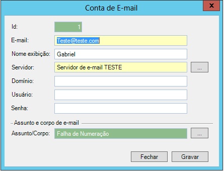 Assunto e corpo de e-mail: Selecione Assunto e corpo do e-mail, já configurados, para serem utilizados pela conta de e-mail cadastrada.