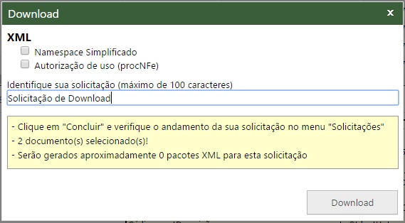 Quando selecionado mais de um documento no grid ou mais de um formato for escolhido para o processo de download, é obrigatório preencher o campo Identifique sua solicitação, na qual pode ser visualizado o andamento das solicitações através da tela Solicitações.