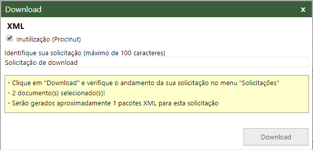 Realizado todos os passos, clique em Download e será informado ao usuário o sucesso ou não da geração de sua Solicitação.