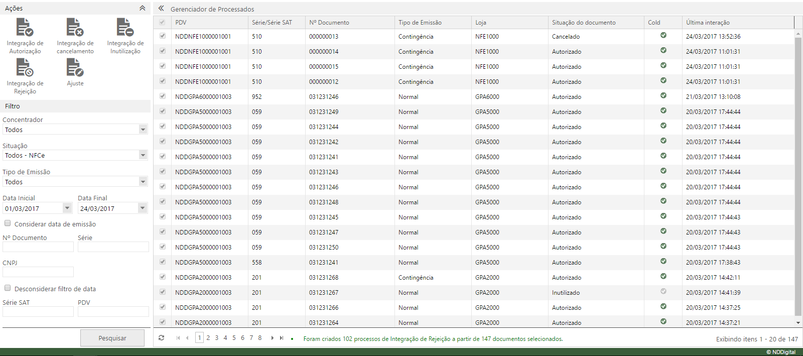 Utilizando esta opção, serão criados novos processos de integração de rejeição para todos os documentos selecionados. Será demonstrado no rodapé da página a quantidade de integrações que foram criadas, ou então uma mensagem informando que não foram encontrados processos com o filtro configurado, quando nenhum documento pesquisado setisfazer o tipo de integração solicitada.