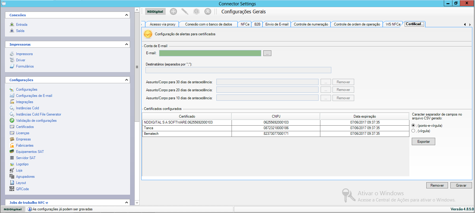 Nesta aba é possível ainda exportar relatórios dos certificados listados no grid. Para isto, selecione o caractere separador de campos no arquivo CSV a ser gerado (vírgula ou ponto-e-vírgula) e clique em Exportar.