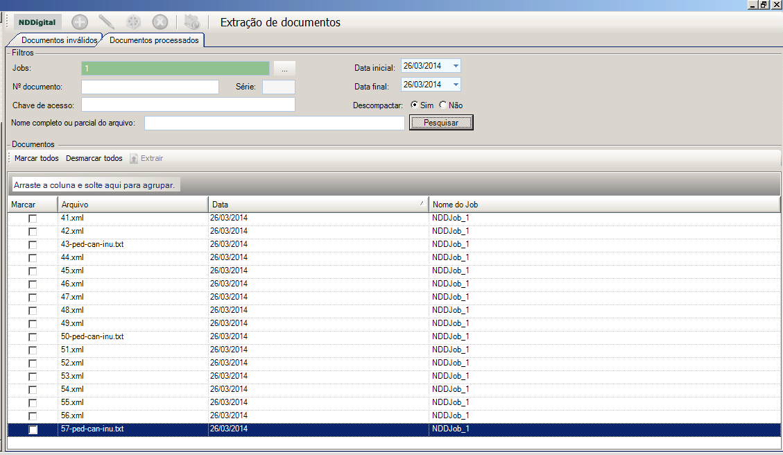A opção Descompactar permite optar por extrair os arquivos compactados ou descompactados. Como resultado da pesquisa, são trazidas no Grid as seguintes informações: