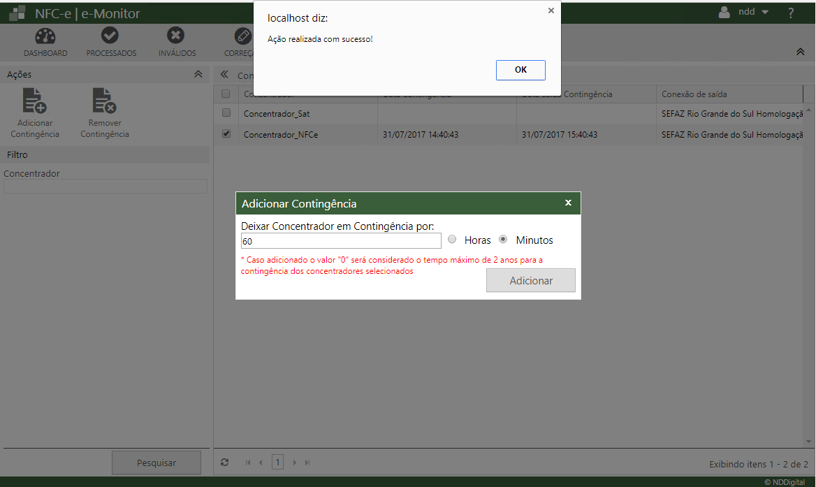 •Será apresentado uma tela para que seja informado o período que o concentrador ficará em contingência, podendo ser em minutos ou horas