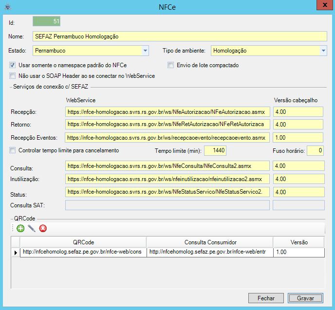 Verificar se o estado já está atualizado para as especificações da Nota Técnica 2010/00, caso esta esteja em vigor, a opção Usar somente namespace padrão da NFC-e deverá estar marcada.