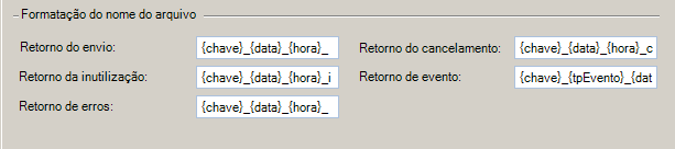 ▪Formatação do nome do arquivo: nome que será dado aos arquivos de retorno do envio, retorno da inutilização, retorno de erros, retorno de evento. O nome do arquivo pode receber três parâmetros para diferenciá-lo, são eles: chave de acesso {chave}, data de envio {data}, hora de envio {hora} o tipo de evento {tpEvento} é o parâmetro utilizado somente para retorno de eventos. Também é possível utilizar uma literal no final ou no início desses arquivos.