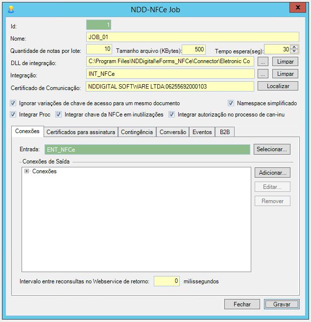 Como está se configurando um Job do tipo NFC-e, a primeira conexão selecionada deverá ser a conexão de saída NFC-e.