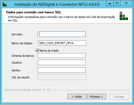 Também são informados os dados de conexão com o banco de dados do Cold de Exportação, as informações dos dados seguem o mesmo conceito da conexão com o banco de dados do Connector NFC-e, conforme a descrição de cada campo no passo 3, considerando que as informações inseridas são direcionadas para o banco de dados do Cold de Exportação. Se no momento da instalação, for selecionada uma das opções de SQL, a tela abaixo será exibida. Após informar os dados, clique no botão Próximo para dar sequência.