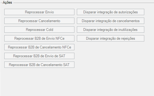 •Reprocessar Cold: muda o status dos processos de envio normal e de envio de cancelamento para o Cold que estão com status processado, erro ou abortado para não processado, fazendo com que os mesmos sejam reprocessados no reinício do serviço.