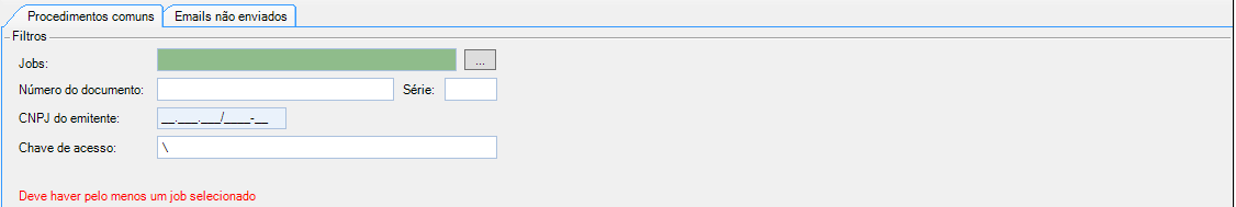 É com base nos campos de filtro que são executadas todas as operações disponíveis para lotes e documentos em Procedimentos comuns. O único campo de preenchimento obrigatório é o Job. Os campos Número do documento e Chave de acesso nunca poderão ser preenchidos juntos, deve-se escolher entre um dos dois para pesquisar documentos.