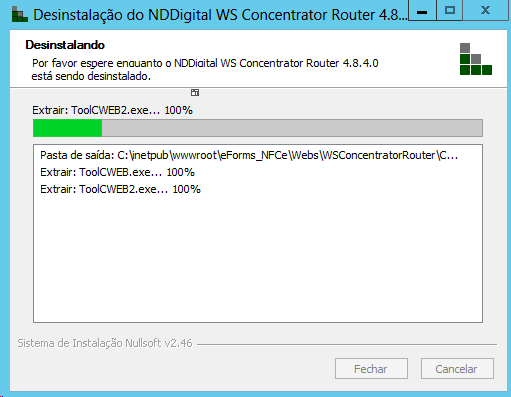 Desinstalação do Módulo Web Services Concentrator Router NFC-e: para desinstalar, acesse o menu Iniciar>Programas>NDDigital e-Forms NFC-e>WS Concentrator Router>Uninstall. Para prosseguir, siga os passos abaixo: