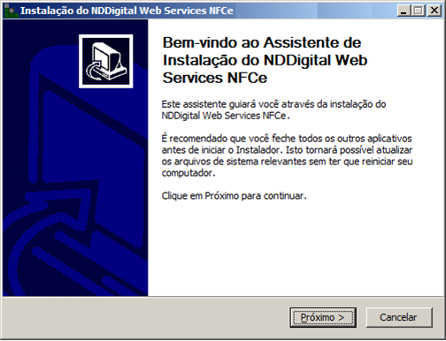 Execute o arquivo de instalação do Web Services NFC-e disponibilizado pela NDDigital. Você também pode fazer o download dos instaladores acessando o site da NDDigital, efetuando seu cadastro de usuário. Para isso, acesse http://ndd.com.br/.