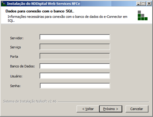 Tendo selecionado uma das opções de SQL, a tela abaixo será exibida, para que sejam informados os dados de conexão com o banco de dados: