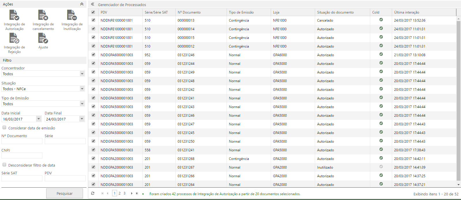 Utilizando esta opção, serão criados novos processos de integração de autorização para todos os documentos selecionados. Será demonstrado no rodapé da página a quantidade de Integrações que foram criadas, ou então uma mensagem informando que não foram encontrados processos com o filtro configurado, quando nenhum documento pesquisado setisfazer o tipo de integração solicitada.