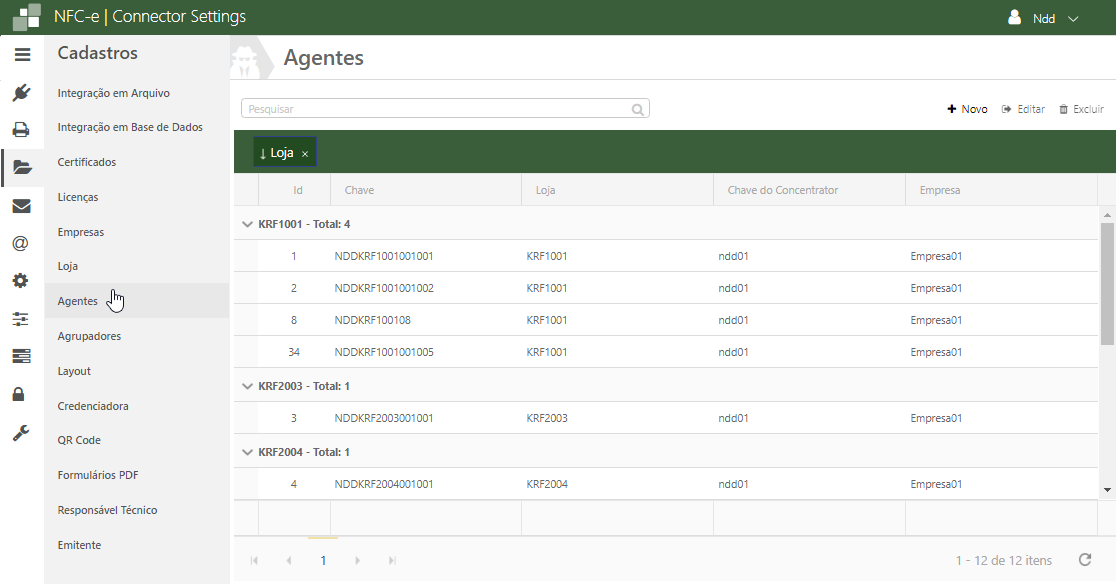 Nesta tela é apresentado todos os agentes cadastrados manualmente, como também os cadastrados automaticamente através do processamento via Agente/Concentrador. Para cadastrar uma nova loja clique em +Novo. Será exibida a tela para cadastro dos dados, preencha-os conforme descrito abaixo.