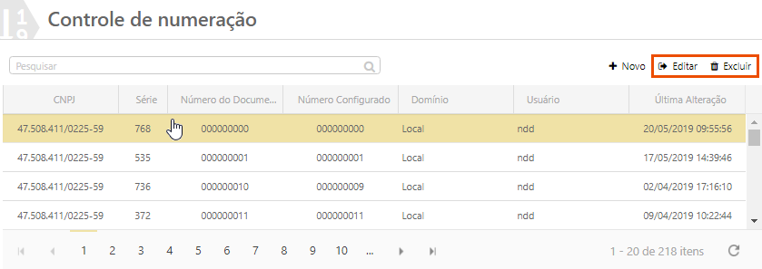 Ao selecionar um registro e clicar em excluir, será removido apenas o número configurado para a série e CNPJ, ou seja, não é removido o controle de numeração e sim a configuração.