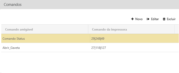 Comandos de impressão: Nesta área será possível cadastrar nomes amigáveis para a execução de comandos serial e seus respectivos retornos. Clique em +Novo para adicionar um novo registro, em cada uma das três áreas descritas a seguir.