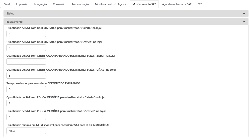 ✓ Quantidade de SAT com POUCA MEMÓRIA para sinalizar status "crítico" na loja: Informe a quantidade de equipamentos SATs com POUCA MEMÓRIA para sinalizar no e-monitor o status crítico;