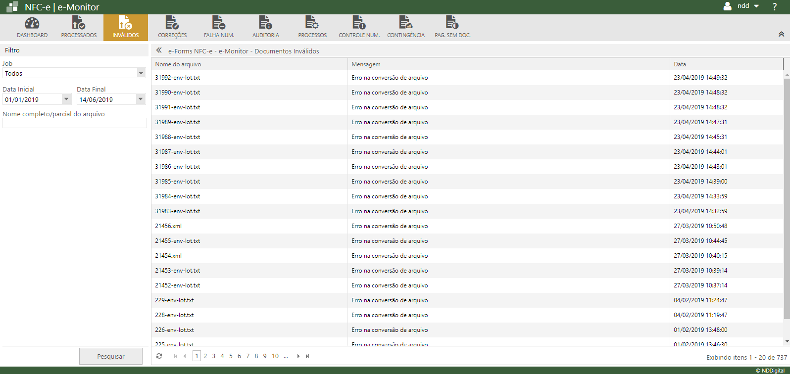 Ao clicar em INVÁLIDOS, a seguinte tela é apresentada, onde é exibido todos os documentos que apresentaram problemas no momento da validação.
