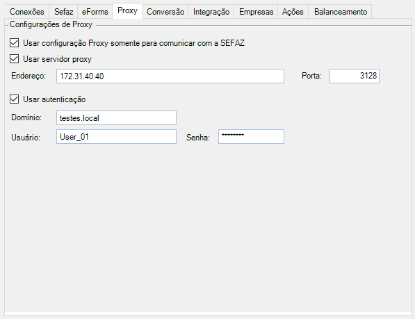 ✓ Usar configuração Proxy somente para comunicar com a SEFAZ: Ao marcar esta opção o concentrador deverá utilizar as configurações de proxy somente para envio à SEFAZ;