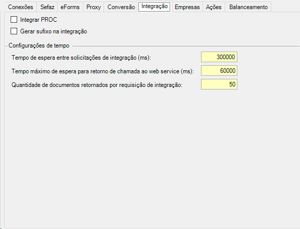 ✓ Tempo de espera para empacotamento dos arquivos (ms): Tempo para realizar os empacotamentos dos arquivos para envio para o e-Forms NFC-e;